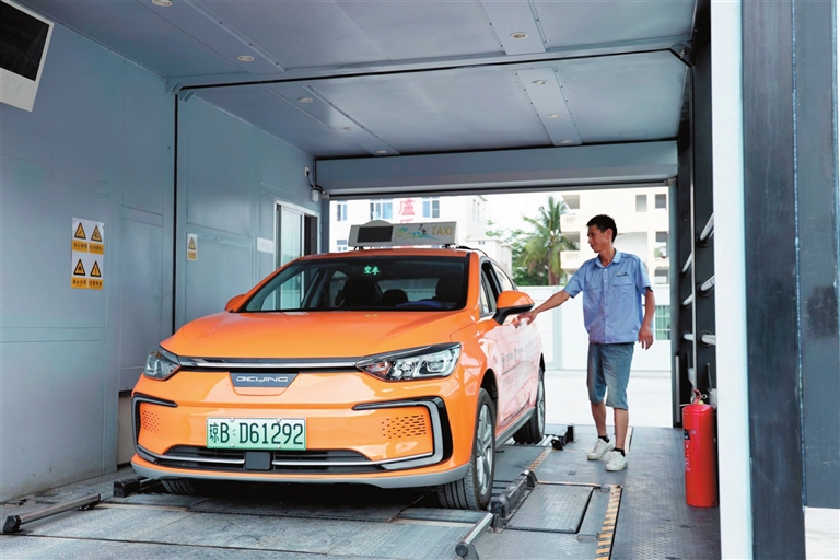 在南邊海新能源汽車(chē)換電站,出租車(chē)司機(jī)剛給車(chē)換完電。 記者 黃世烽 攝