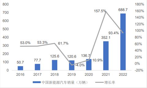 2016-2022 年中國新能源汽車年銷量及增長率