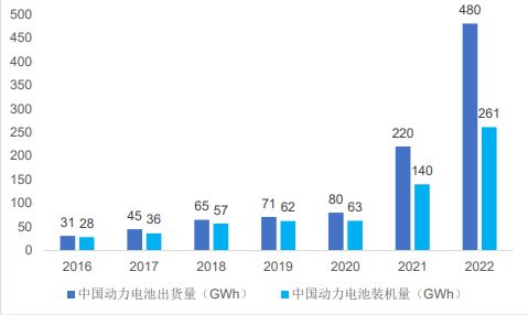 2016-2022 年中國動力電池出貨量及裝機量