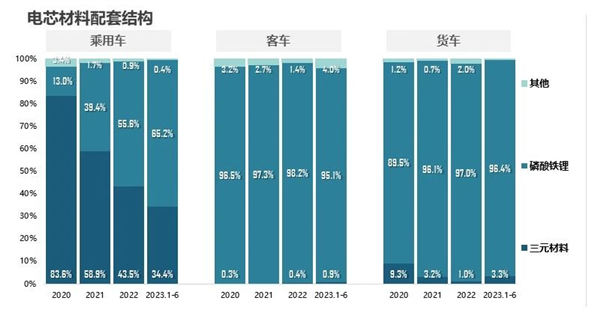 2023年1-6月, 乘用車領域,磷酸鐵鋰電芯配套率達65.2%,而商用車領域中基本已完成了對其他材料電芯的替代。