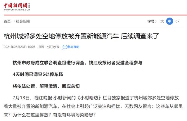 2021年7月,《錢江晚報·小時新聞》的《小時暗訪》欄目報道了杭州城郊多處空地停放大量新能源汽車一事。杭州市政府旋即部署了由市交通運(yùn)輸局(管理中心、執(zhí)法隊)、市公安局(交通治安分局、交警支隊)牽頭的聯(lián)合調(diào)查小組,摸排在城市郊區(qū)集中停放的新能源汽車情況。