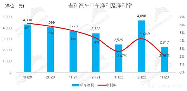 2023 年上半年吉利汽車實(shí)現(xiàn)歸母凈利潤 15.7 億元,同比增長約 1%,略超市場預(yù)期 15.1 億元。但凈利率下滑從 2022 年上半年 2.7% 下滑至 2023 年上半年 2.2%, 單車凈利也從 2529 元降低至 2317 元。