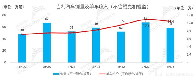 根據(jù)海豚君計(jì)算,公司 2023 年上半年實(shí)現(xiàn)單車收入(不含領(lǐng)克和睿藍(lán))10.4 萬元,同比增 10%,超出市場預(yù)期 9.2 萬元。