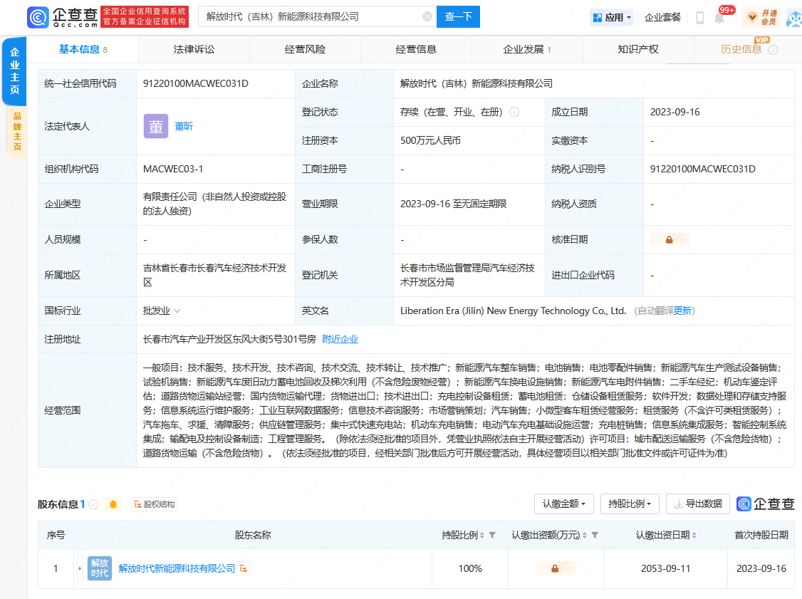近日,解放時(shí)代(吉林)新能源科技有限公司成立,法定代表人為董昕,注冊(cè)資本500萬人民幣,經(jīng)營(yíng)范圍含新能源汽車整車銷售、電池銷售、電池零配件銷售、電動(dòng)汽車充電基礎(chǔ)設(shè)施運(yùn)營(yíng);充電樁銷售;信息系統(tǒng)集成服務(wù);智能控制系統(tǒng)集成;輸配電及控制設(shè)備制造等。股權(quán)全景穿透圖顯示,該公司由解放時(shí)代新能源科技有限公司全資持股,后者由一汽解放汽車有限公司、寧德時(shí)代分別持股50%。