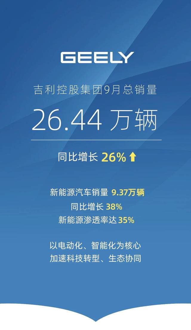 從吉利控股集團官方公告獲悉,吉利控股集團 9 月汽車總銷量 26.44 萬輛,同比增長 26%。新能源汽車銷量 9.37 萬輛,同比增長 38%,新能源滲透率為 35%。