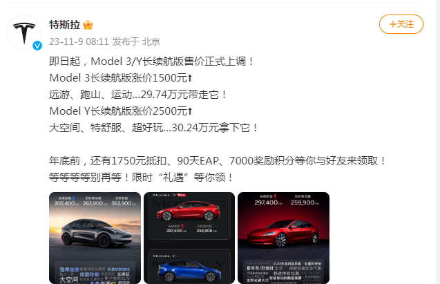 11月9日,特斯拉官方微博發(fā)布消息,即日起,Model 3/Y長續(xù)航版售價正式上調,Model 3長續(xù)航版漲價1500元至29.74萬元。Model Y長續(xù)航版漲價2500元至30.24萬元。