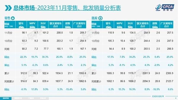 11月,國內(nèi)狹義乘用車生產(chǎn)、批發(fā)、零售端皆呈現(xiàn)同環(huán)比雙增長的有力表現(xiàn),并連續(xù)第三個(gè)月齊齊站上200萬輛關(guān)口。1-11月,狹義乘用車生產(chǎn)、批發(fā)、零售累計(jì)增速繼續(xù)擴(kuò)大,分別達(dá)到7.4%、8.9%和5.3%,較1-10月各自提升1.9、1.7和2.1個(gè)百分點(diǎn)。