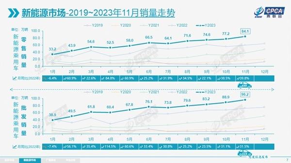 聚焦新能源市場,11月,新能源乘用車生產(chǎn)、批發(fā)、零售同比增速繼續(xù)維持在30%以上。其中,生產(chǎn)98.9萬輛,同比增長37.3%,環(huán)比增長7.2%;批發(fā)96.2萬輛,同比增長31.5%,環(huán)比增長8.2%;零售84.1萬輛,同比增長39.8%,環(huán)比增長8.9%,1-11月累計(jì)零售680.9萬輛,同比增長35.2%。