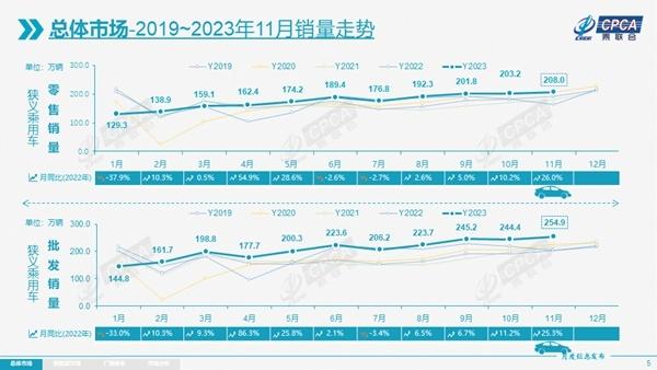 零售方面,11月,狹義乘用車共售出208.0萬輛,同比增長26.0%,環(huán)比增長2.4%;1-11月累計(jì)零售量達(dá)1934.5萬輛,同比增長5.3%。乘聯(lián)會(huì)秘書長崔東樹分析, “近年來,乘用車市場在年末持續(xù)升溫已成為常態(tài)走勢,這主要是受新能源車持續(xù)增長以及小批量國六a車型清庫存推動(dòng)。今年11月,車市促銷力度維持較高水平,地方補(bǔ)貼頻出,因此乘用車銷量繼續(xù)抬升。”