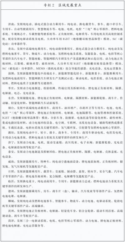 3.提升核心部件配套能力。根據(jù)區(qū)域產(chǎn)業(yè)要素分布與配置情況,重點布局核心部件產(chǎn)業(yè),推動整車與零部件、原材料協(xié)同發(fā)展,力爭電池包、電機(jī)、電控等產(chǎn)品達(dá)到國內(nèi)主流水平,電池正負(fù)極材料、電解液與電機(jī)磁性材料領(lǐng)先發(fā)展,實現(xiàn)國內(nèi)外市場同步開拓。積極培育底盤系統(tǒng)、自動駕駛、智慧座艙等研發(fā)團(tuán)隊,打造細(xì)分領(lǐng)域新龍頭。加快打造棗莊北方鋰電之都、泰安鋰谷,壯大東營鋰電基礎(chǔ)材料基地,培育濟(jì)南、青島、煙臺、濟(jì)寧、菏澤“三電”核心零部件產(chǎn)業(yè)集聚區(qū)。(牽頭單位:省發(fā)展改革委、省工業(yè)和信息化廳)