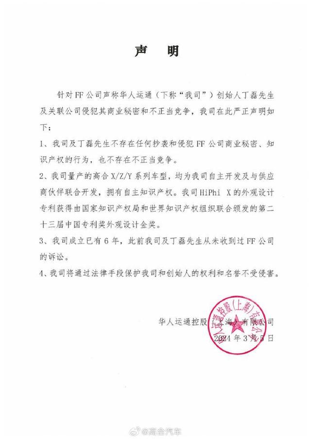而在最新聲明中,高合汽車也指出,“我司成立已有6年,此前我司及丁磊先生從未收到過FF公司的訴訟。我司將通過法律手段保護(hù)我司和創(chuàng)始人的權(quán)利和名譽(yù)不受侵害。”