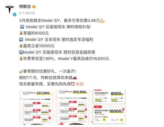 3月1日,特斯拉宣布Model 3、Model Y限時(shí)特惠,3月底前提走M(jìn)odel 3/Y,最多可享優(yōu)惠3.46萬(wàn)。本次特斯拉降價(jià)頗為低調(diào),沒(méi)有直接調(diào)降車價(jià),而是以保險(xiǎn)補(bǔ)貼、車漆福利等名目促銷。Model 3后驅(qū)版新車價(jià)245900元,保險(xiǎn)補(bǔ)貼后低至237900元。Model Y后驅(qū)版新車價(jià)258900元,保險(xiǎn)補(bǔ)貼后低至250900元。