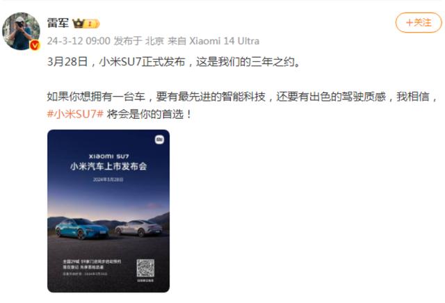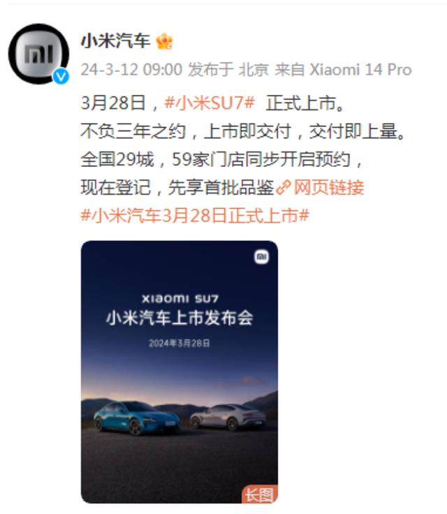 3月12日,雷軍發(fā)布微博稱(chēng),“3月28日,小米SU7正式發(fā)布,這是我們的三年之約。”小米汽車(chē)官方微博同時(shí)宣布小米SU7將于3月28日正式上市并交付,并在全國(guó)59家門(mén)店同步開(kāi)啟預(yù)約。