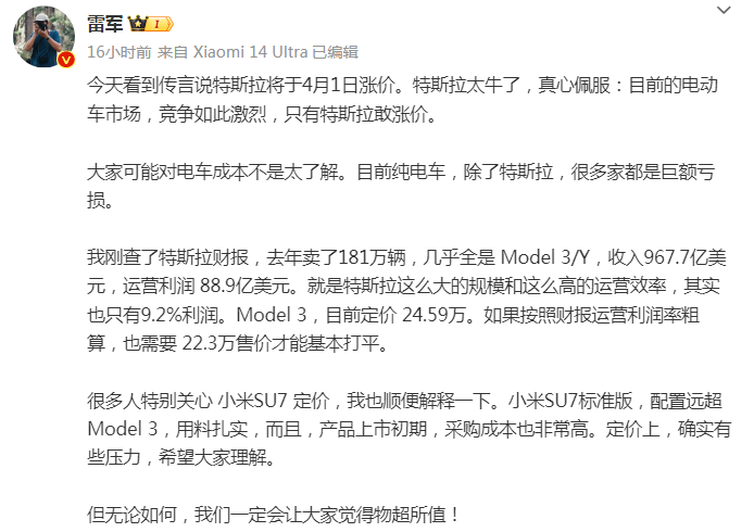 雷軍還提到了小米SU7的定價(jià),他表示:“小米SU7標(biāo)準(zhǔn)版,配置遠(yuǎn)超 Model 3,用料扎實(shí),而且,產(chǎn)品上市初期,采購成本也非常高。定價(jià)上,確實(shí)有些壓力,希望大家理解。”