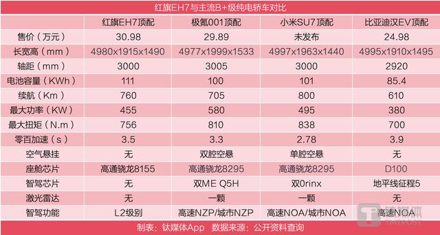 尺寸方面,紅旗EH7的車身尺寸和軸距,與極氪001和小米SU7相當(dāng),好于比亞迪漢EV。從近期體驗過的評價來看,EH7的乘坐舒適度和二排空間受到好評。