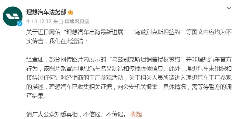 此外,@理想汽車(chē)法務(wù)部 日前發(fā)文稱(chēng),關(guān)于近日網(wǎng)傳“理想汽車(chē)出海最新進(jìn)展”“烏茲別克斯坦簽約”等圖文內(nèi)容均為不實(shí)傳言。