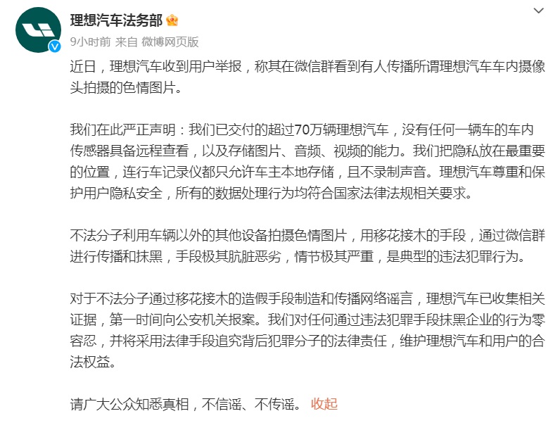 4月15日,@理想汽車(chē)法務(wù)部 發(fā)文稱(chēng),近日收到用戶舉報(bào),稱(chēng)其在微信群看到有人傳播所謂理想汽車(chē)車(chē)內(nèi)攝像頭拍攝的色情圖片。