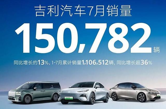 7月,吉利汽車銷量為150782輛,同比增長(zhǎng)13%;1-7月累計(jì)銷量1106512輛,同比增長(zhǎng)超36%。其中,新能源銷量59051輛,同比增長(zhǎng)58%;1-7月新能源累計(jì)銷量379236輛,同比增長(zhǎng)105%。