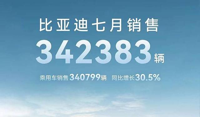 比亞迪官方公布其7月乘用車銷售340799輛,同比增長(zhǎng)30.5%,純電車型銷量達(dá)130,000輛,插混車型210,799輛。1-7月,比亞迪乘用車?yán)塾?jì)銷售1,947,944輛,同比增長(zhǎng)29.07%。