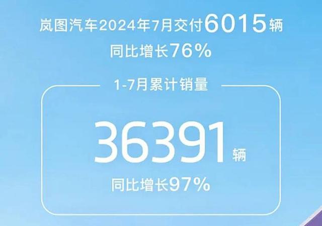 月嵐圖汽車交付6015輛,同比增長(zhǎng)76%,1-7月累計(jì)交付36391輛,同比增長(zhǎng)97%。