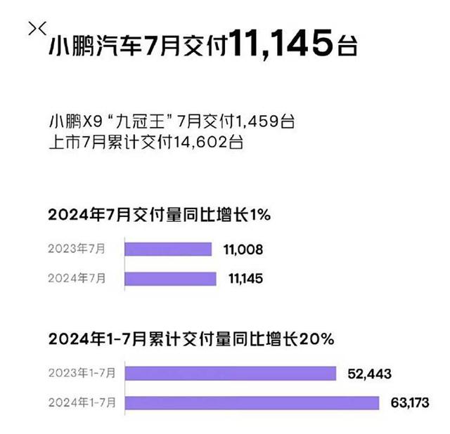 7月小鵬汽車共交付新車11,145臺(tái),同比增長(zhǎng)1%,環(huán)比增長(zhǎng)4%。1月-7月,小鵬汽車?yán)塾?jì)交付新車共63,173臺(tái),同比增長(zhǎng)20%。