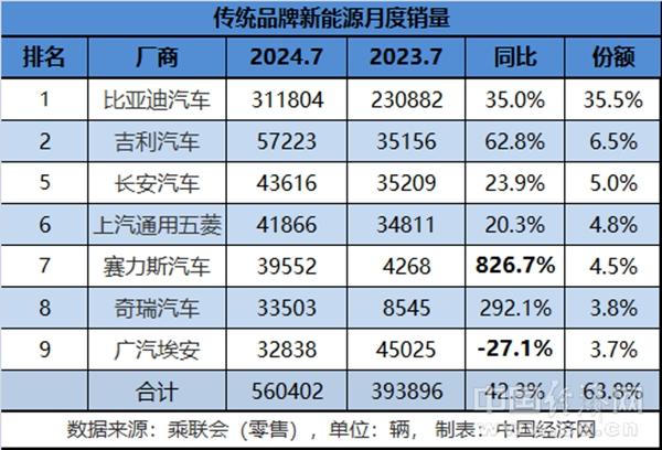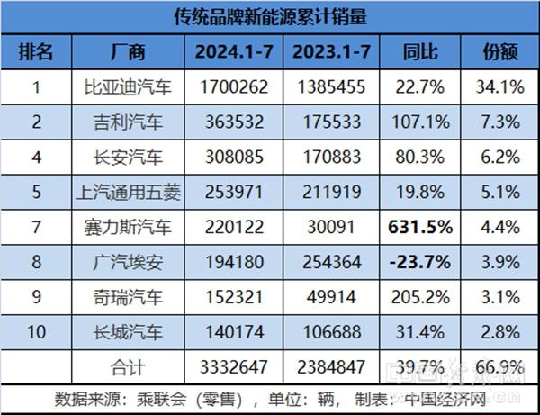 從前7個(gè)月的累計(jì)銷量來看,傳統(tǒng)新能源車企還是維持原有格局,入圍前十榜單的8家品牌的合計(jì)銷量超過333萬輛,同比增長39.7%,在新能源乘用車總銷量中的占比近七成。