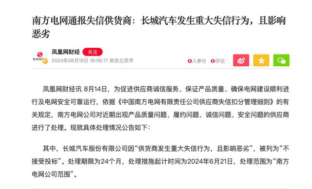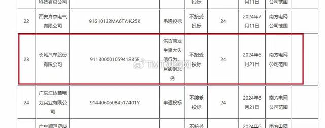 其中,長城汽車股份有限公司因“供貨商發(fā)生重大失信行為,且影響惡劣”,被列為“不接受投標(biāo)”。處理期限為24個月,處理措施起計時間為2024年6月21日,處理范圍為“南方電網(wǎng)公司范圍”。