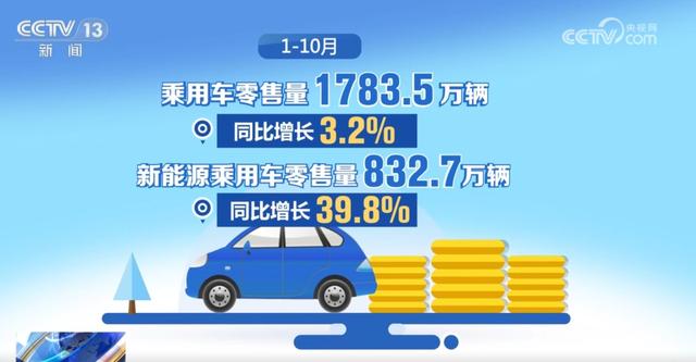在以舊換新政策的帶動下,汽車銷量也有了明顯增長。10月份,乘用車零售量226.1萬輛,同比增長11.3%,增速較9月加快6.8個百分點。其中,新能源乘用車零售量119.6萬輛,同比增長56.7%,增速較9月加快5.8個百分點,占乘用車零售量的比重達(dá)52.9%。1—10月,乘用車零售量1783.5萬輛,同比增長3.2%。其中,新能源乘用車零售量832.7萬輛,同比增長39.8%。(央視網(wǎng))