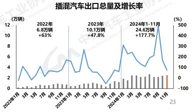 細(xì)分來看,插電式混合動力汽車出口增速已遠(yuǎn)超純電動汽車。數(shù)據(jù)顯示,1~11月,我國純電動汽車出口89.4萬輛,同比下降10.8%;插電式混合動力汽車出口24.6萬輛,同比增長1.8倍。其中,11月,純電動汽車出口5.8萬輛,環(huán)比下降43.8%,同比下降29.2%;插電式混合動力汽車出口2.5萬輛,環(huán)比增長1.9%,同比增長74.3%。