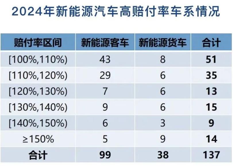 承保的2795個(gè)車系中,賠付率超過100%(即虧損)的高賠付率車系有137個(gè)。其中,新能源客車共承保車系1654個(gè),承保2982萬輛;承保車輛數(shù)超過1萬輛的車系301個(gè),其中賠付率超過100%的車系有99個(gè)。新能源貨車共承保車系1141個(gè),承保123萬輛;承保車輛數(shù)超過0.5萬輛的車系55個(gè),其中賠付率超過100%的車系有38個(gè)。