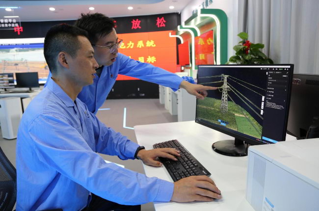 國(guó)網(wǎng)晉城供電公司員工在無(wú)人機(jī)實(shí)驗(yàn)室對(duì)線路激光雷達(dá)建模數(shù)據(jù)進(jìn)行分析