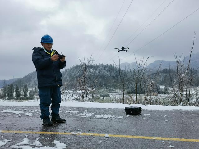 雪鵝毛般下得很大,一路上車很少,鄭鋒將車提前裝好防滑鏈后一直保持不超過30碼的車速小心行駛,到達110千伏黃牽線40號塔附近,室外氣溫已達-5度,迎著刮臉刺骨的風,4人向塔所在的山腰挺進。一時間雪下小了,短暫的“空窗期”給了他們飛無人機的絕佳機會。