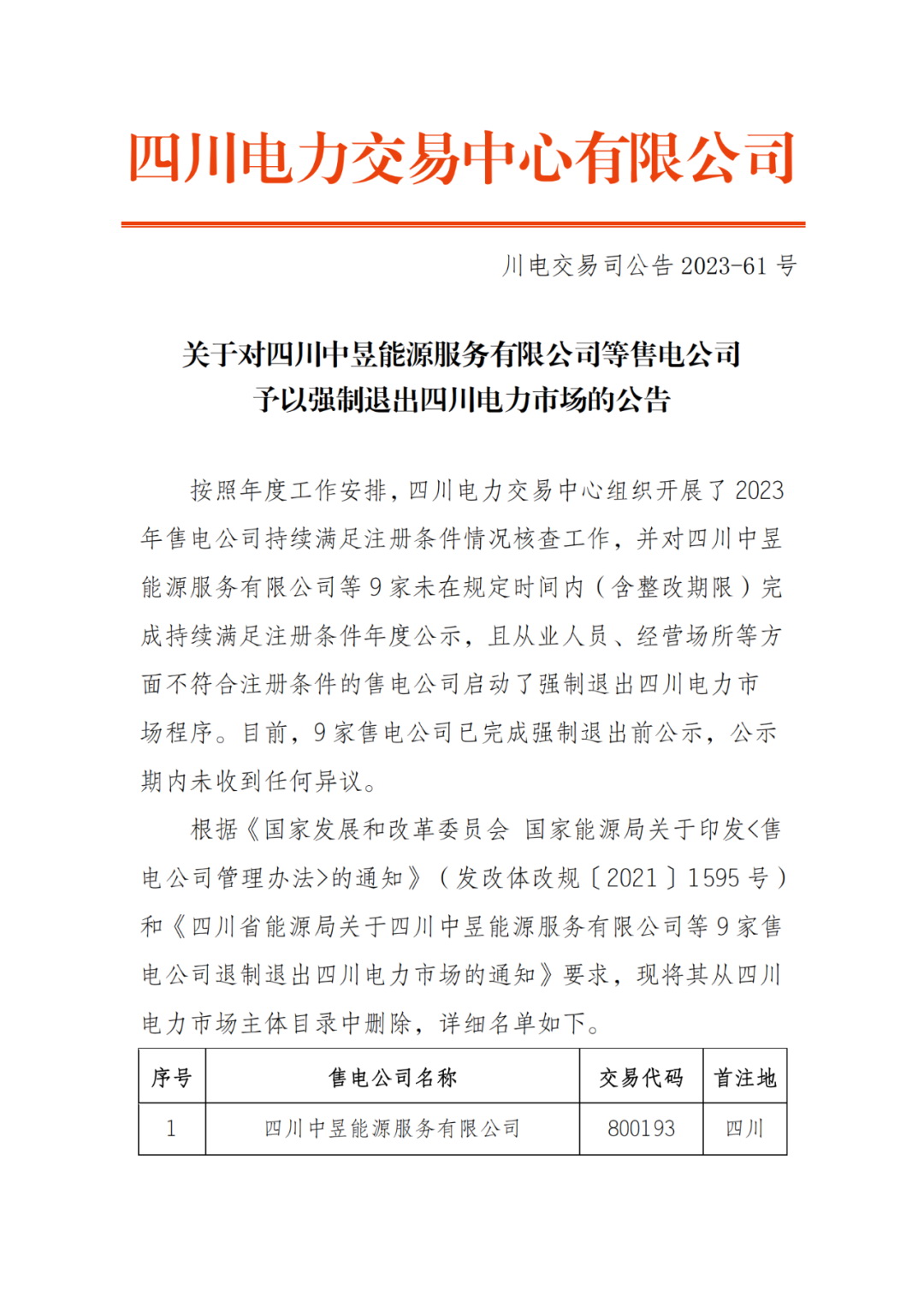 8月7日,四川電力交易中心發(fā)布《關(guān)于對(duì)四川中昱能源服務(wù)有限公司等售電公司予以強(qiáng)制退出四川電力市場(chǎng)的公告》。詳情如下: