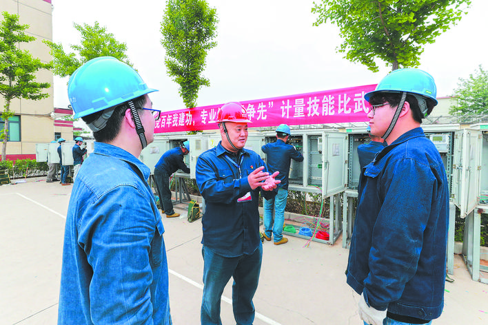 張遠平(左)在計量專業(yè)技能比武活動現(xiàn)場,向選手講解裝表接電技術要點。黃曉東 攝
