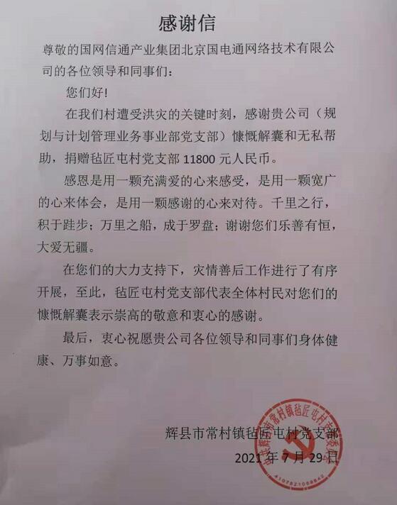 中國電力網(wǎng)訊 (通訊員 朱友宇) “在您們的大力支持下,災(zāi)情善后工作進行了有序開展,至此,氈匠屯村黨支部代表全體村民對您們的慷慨解囊表示崇高的敬意和衷心的感謝”,輝縣市常村鎮(zhèn)氈匠屯村黨支部在感謝信中寫道。7月29日,國網(wǎng)信通產(chǎn)業(yè)集團國電通規(guī)劃與計劃管理業(yè)務(wù)事業(yè)部黨支部收到了一封特殊的感謝信,這封信不是來自用戶的,也不是來自上級單位的,它來自輝縣市常村鎮(zhèn)氈匠屯村黨支部。