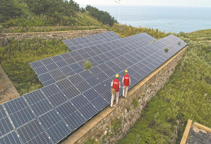 國(guó)家電網(wǎng)江蘇電力(連云港)共產(chǎn)黨員服務(wù)隊(duì)隊(duì)員在位于贛榆區(qū)厲莊鎮(zhèn)的二龍山光伏發(fā)電站,幫助客戶檢查光伏發(fā)電設(shè)備。
