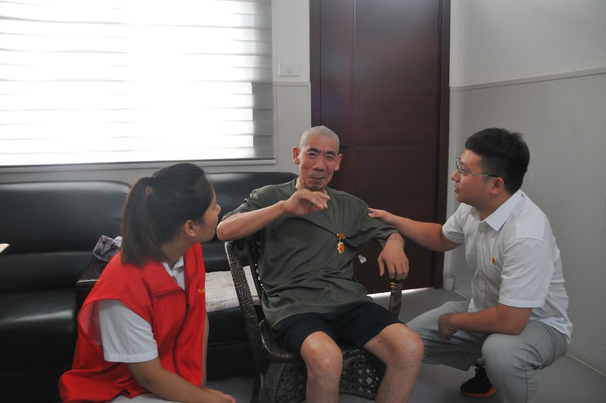 活動中,在看望98歲高齡的抗戰(zhàn)老兵李位發(fā)和60歲老人宋洪彥時,志愿者給老人送上了精心準(zhǔn)備的慰問品,和老人促膝交談,對其為國家所作出的貢獻表示感謝。老人向大家講述自己參加抗美援朝戰(zhàn)爭和中越邊境自衛(wèi)反擊戰(zhàn)時的經(jīng)歷。志愿者還詳細(xì)詢問了老人的身體健康情況,并叮囑老人要保重身體,祝愿老人健康長壽。