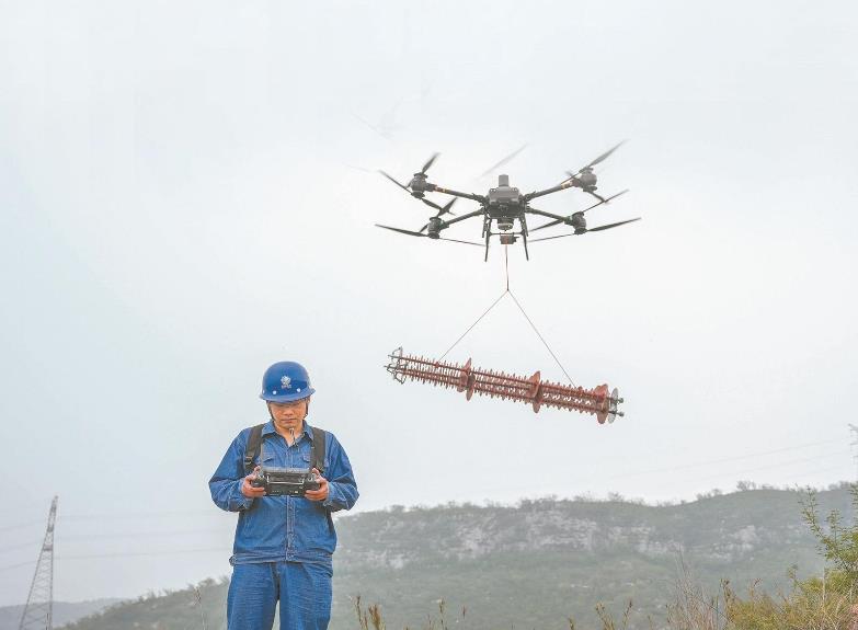柔性攻關(guān)創(chuàng)新團(tuán)隊(duì)成員應(yīng)用改造后的重載無人機(jī)將合成絕緣子串送至220千伏梁柏Ⅰ線檢修現(xiàn)場(chǎng)。