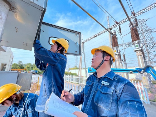 國(guó)網(wǎng)河南新鄉(xiāng)供電公司員工冒著40℃的高溫檢修變電設(shè)備。