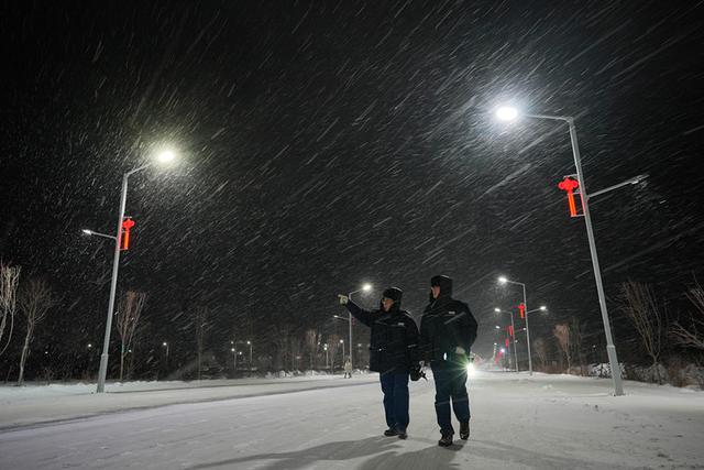 國網蒙東電力員工對保暖涉及配電線路進行夜巡。