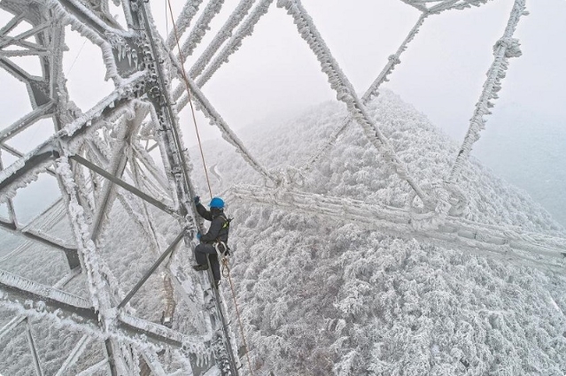 國網(wǎng)湖北電力員工清除±800千伏陜武特高壓直流輸電線路地線覆冰。