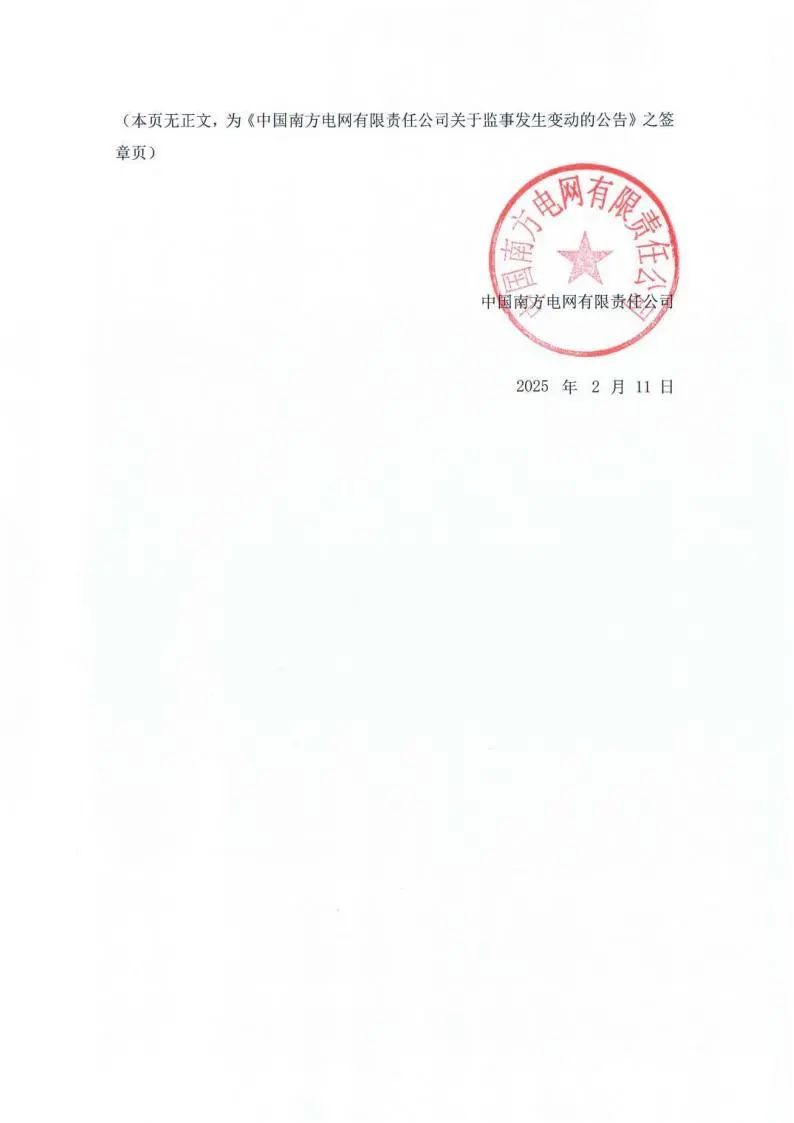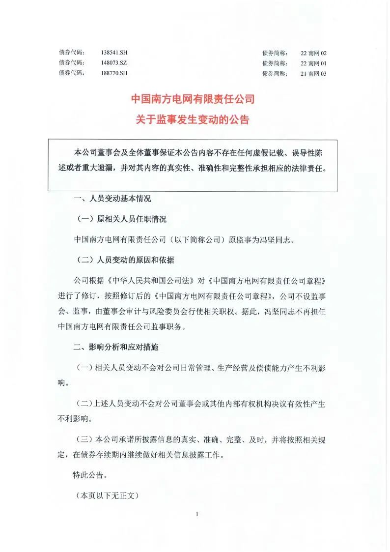 2月11日,中國南方電網(wǎng)有限責任公司發(fā)布關于監(jiān)事發(fā)生變動的公告。公司根據(jù)《中華人民共和國公司法》對《中國南方電網(wǎng)有限責任公司章程》進行了修訂,按照修訂后的《中國南方電網(wǎng)有限責任公司章程》,公司不再設監(jiān)事會、監(jiān)事,由董事會審計與風險委員會行使相關職權。據(jù)此,馮堅同志不再擔任中國南方電網(wǎng)有限責任公司監(jiān)事職務。