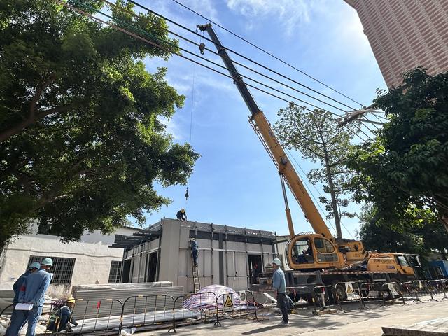 在施工技術(shù)上,江門蓬江供電局不僅引入了自動化挖掘機(jī)、起重機(jī)、混凝土攪拌車等機(jī)械,還摒棄傳統(tǒng)配電站的磚瓦結(jié)構(gòu),采用高強(qiáng)度、輕質(zhì)、耐腐蝕的成品預(yù)制墻板及鋼結(jié)構(gòu)等新型建筑材料,結(jié)合裝配式施工工藝,減少以往現(xiàn)場焊接、切割等工藝帶來的環(huán)境污染,大大縮短了施工周期,還減少建筑垃圾的產(chǎn)生。“與傳統(tǒng)純?nèi)斯な┕し绞较啾?,本工程機(jī)械化率達(dá)到85%,工期壓縮了80%,大大減少了對附近居民的影響,也降低了施工過程中的安全隱患。”羅益榮說。
