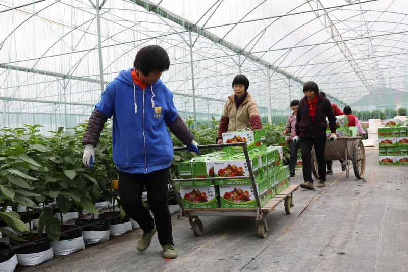 大棚種植基地迎來豐收喜悅,小婷媽媽和高鋒一起搬運豐收的彩椒。孫嘉彪 攝