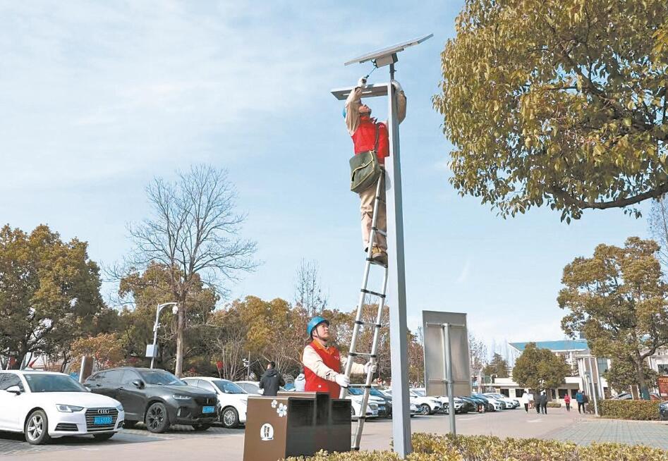 黨員服務(wù)隊隊員來到位于淮安市淮安區(qū)的周恩來紀念館,檢修停車場的光伏路燈。