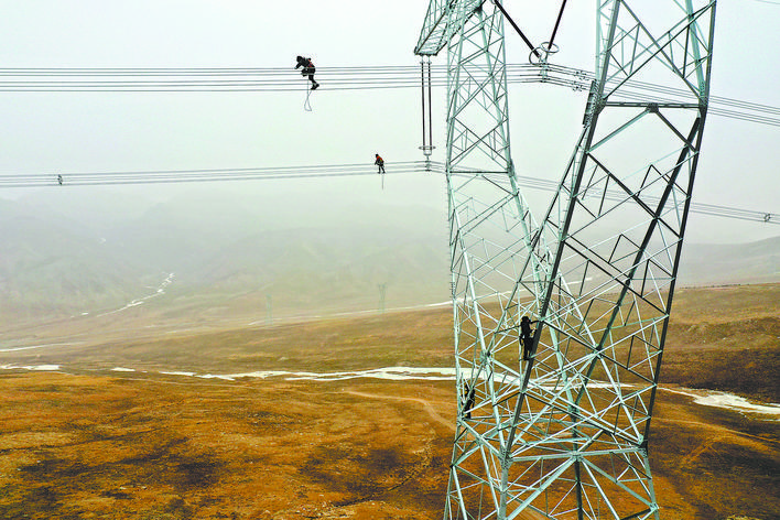 青海省海南藏族自治州,在海拔4000米的拉脊山上,座座鐵塔架起條條銀線。1月24日,在距離地面四五十米的電力線路上,幾個小小的身影迎著寒風(fēng)健步行走。