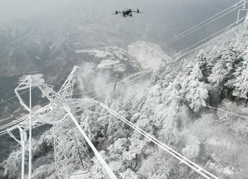 在海拔2800米的雅安市漢源縣蓑衣嶺,氣溫降至零下7℃,連接雅安至樂山的220千伏漢音輸電線路覆冰厚度已達(dá)10毫米。國網(wǎng)雅安供電公司組織電力運(yùn)維人員持續(xù)開展冰情監(jiān)測,運(yùn)用無人機(jī)搭載除冰裝置撞擊覆冰導(dǎo)線完成帶電除冰,及時(shí)消除輸電線路安全隱患。
