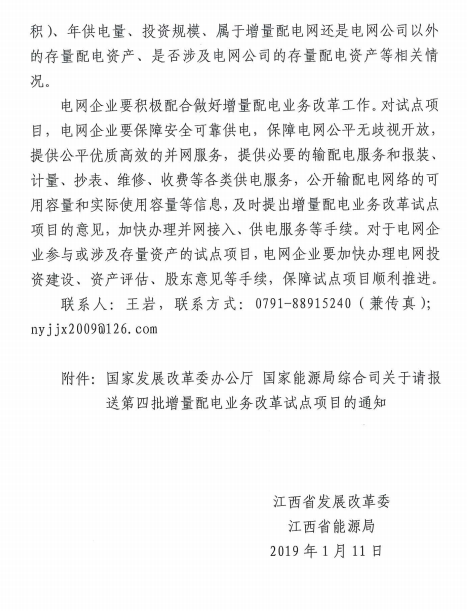 江西省發(fā)改委、江西省能源局日前聯(lián)合發(fā)布了《關(guān)于報(bào)送第四批增量配電業(yè)務(wù)改革試點(diǎn)項(xiàng)目的通知》,要求各地要結(jié)合工作實(shí)際情況,認(rèn)真總結(jié)前三批試點(diǎn)經(jīng)驗(yàn),按照國家相關(guān)要求盡快篩選符合條件的第四批試點(diǎn)項(xiàng)目,試點(diǎn)項(xiàng)目應(yīng)符合省級電網(wǎng)規(guī)劃。強(qiáng)調(diào)電網(wǎng)企業(yè)要積極配合做好增量配電業(yè)務(wù)改革工作。對試點(diǎn)項(xiàng)目,電網(wǎng)企業(yè)要保障安全可靠供電,保障電網(wǎng)公平無歧視開放, 提供公平優(yōu)質(zhì)高效的并網(wǎng)服務(wù),提供必要的輸配電服務(wù)和報(bào)裝、 計(jì)量、抄表、維修、收費(fèi)等各類供電服務(wù),公開輸配電網(wǎng)絡(luò)的可 用容量和實(shí)際使用容量等信息,及時(shí)提出增量配電業(yè)務(wù)改革試點(diǎn)項(xiàng)目的意見,加快辦理并網(wǎng)接入、供電服務(wù)等手續(xù)。