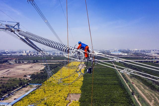 國網(wǎng)天津電力工作人員在板濱500千伏線路工程現(xiàn)場(chǎng)開展高空走線作業(yè)。6月6日攝 國網(wǎng)天津電力供圖