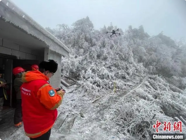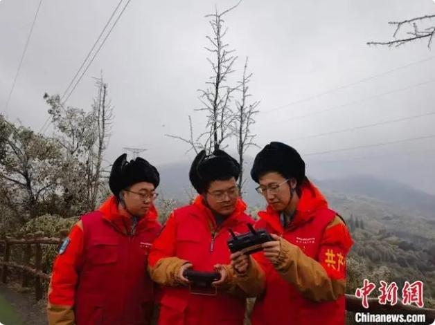 晉電援湘抗冰突擊隊隊員利用無人機觀察冰情。國網(wǎng)山西省電力公司供圖